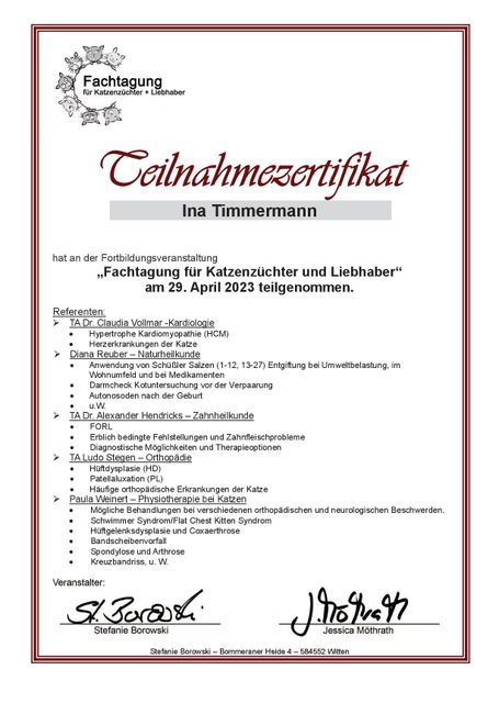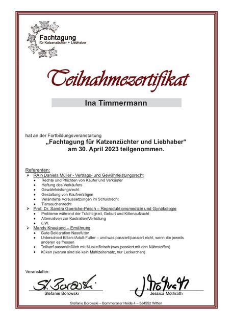 Weiterhin werden unsere Kitten grundsätzlich als Liebhabertiere abgegeben ohne Zuchtzulassung. Dieses ist im Stammbaum vermerkt. Das dient einzig und allein dem Schutz des Tieres, damit sie nicht irgendwo bei Vermehreren/Schwarzzüchtern als Gebärmaschinen enden. Zur Zucht geben wir geeignete Tiere nur ab, wenn eine Vereinszugehörigkeit bei einem ordentlichen Zuchtverein besteht.